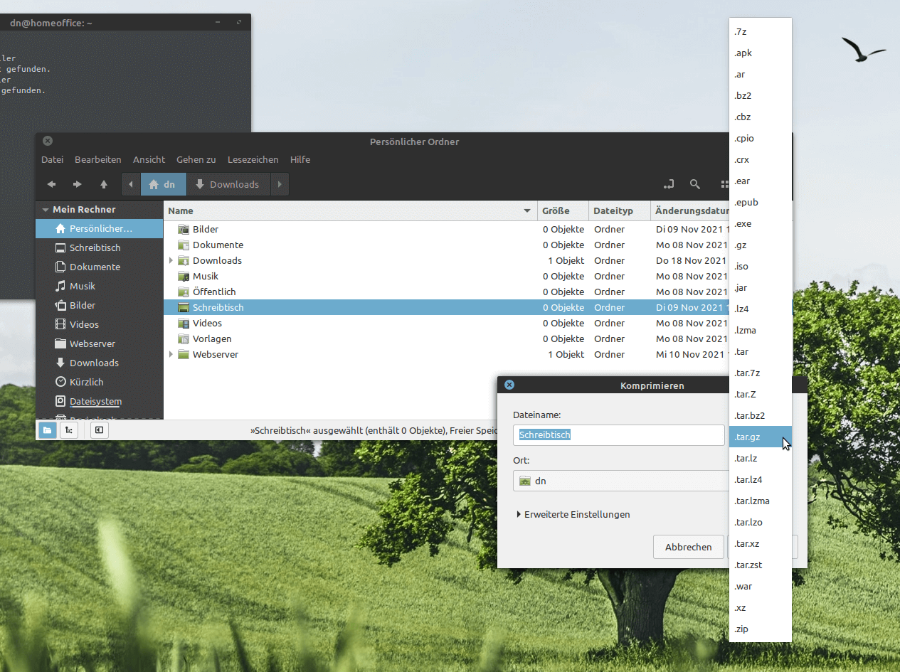 Mit Strg+S und Strg+X habe ich gespeichert und die Datei verlassen. Damit habe ich eine zusätzliche Option „Ordner komprimieren…“ im Rechtsklick-Menü erzeugt. Diese Option wird mir bei jeder Datei und jedem Ordenr angezeigt. Bei MouseOver sehe ich eine klien Bemerkung dazu in der Statusleiste des Dateimanagers und bei Klick wird die gewählte Datei mit dem Kompressor „File-Roller“ geöffnet. Dort kann ich dann wählen, welches Kompressionsformat ich haben möchte.