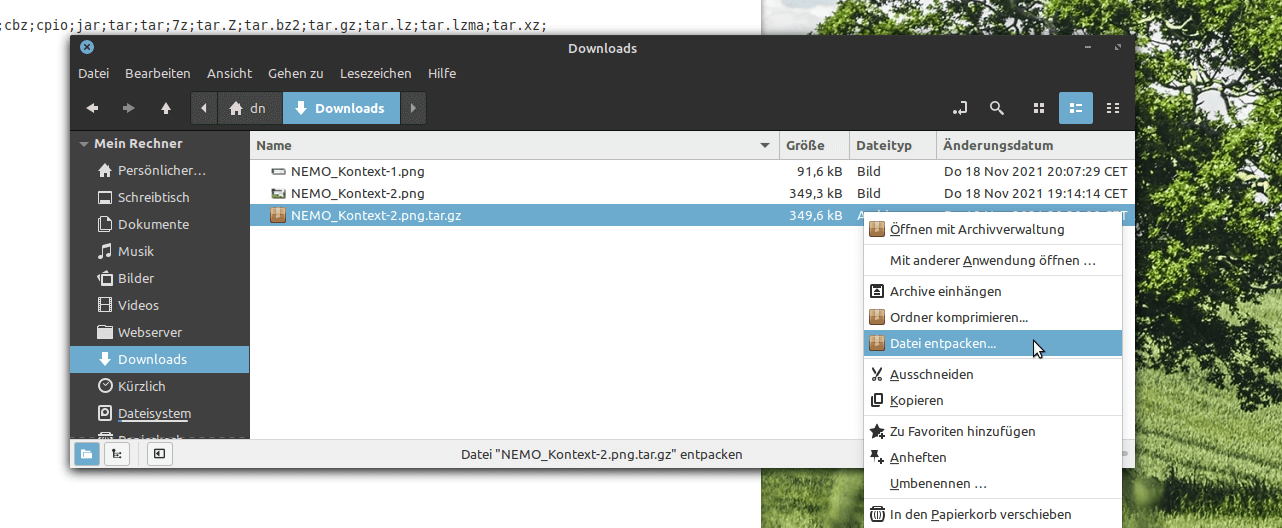 Standardmäßig fehlten mir einige Optionen im Menü, daß nach einem Rechtsklick auf eine Datei erscheint, z.B. die Möglichkeit Ordner komprimieren oder entpacken zu können. Deshalb habe ich mir diese beiden Optionen selber eingerichtet. Dafür müssen die Optionen in NEMO angelegt werden und eventuell auch Programme installiert werden.