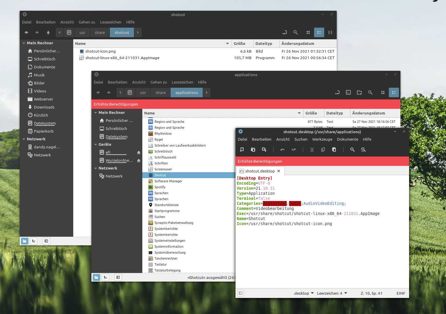 Ich habe mir die aktuellste Version von „ShotCut“, einem Programm zur Videobearbeitung, als AppImage heruntergeladen. Nach dem Herunterladen war das Programm zwar auf meinem Rechner und konnte über das Terminal auch gestartet werden. Aber es gab keinen Desktop-Icon im Menü zwischen meinen anderen Programmen, über den ich „ShotCut“ per Mausklick starten konnte.