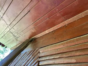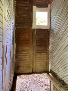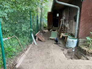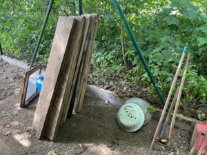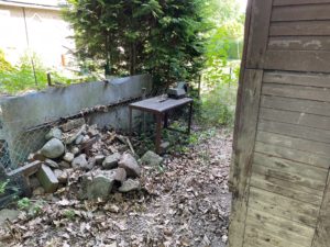 In meiner kleinen Werkstatt konnte ich zwei Wände streichen und die Bodendielen herausnehmen. Unter der Werkstatt, die auch mein Plumpsklo werden soll, habe ich nochmal eine Menge Müll zwischen verrottenden Blätter gefunden.