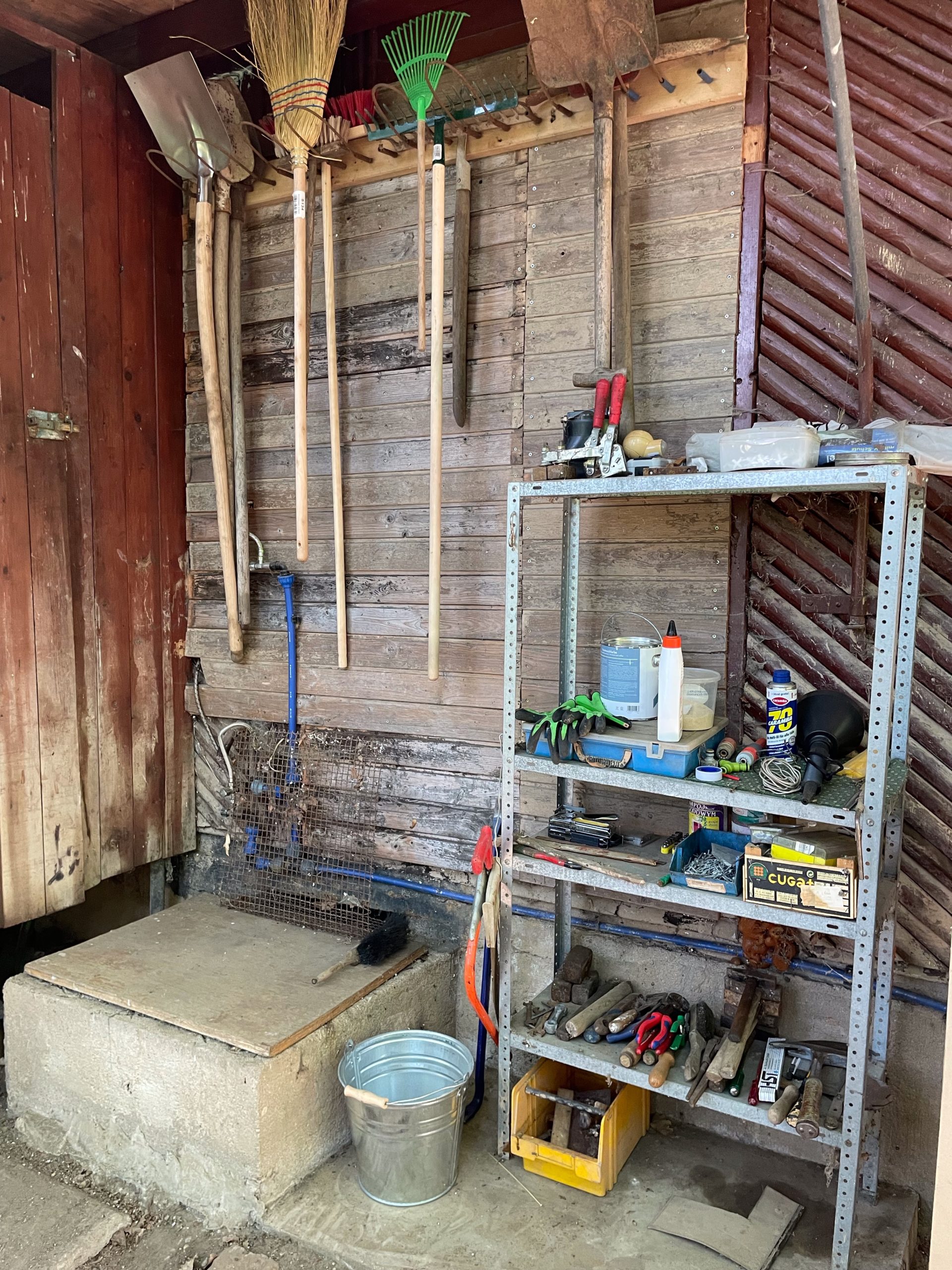 Meine Schippen, Besen, Spaten etc. hängen jetzt an der Rückwand der Laube.