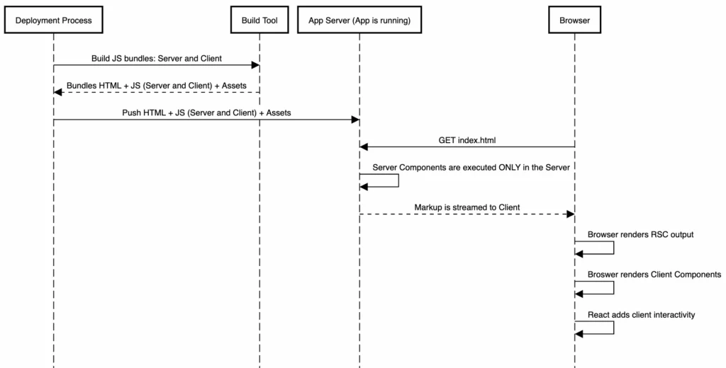 Ablauf: Browser fordert Seite an → Server rendert RSC-Payload (JSON) + Shell-HTML → Browser fügt Markup zusammen → nur Client Components werden hydriert.