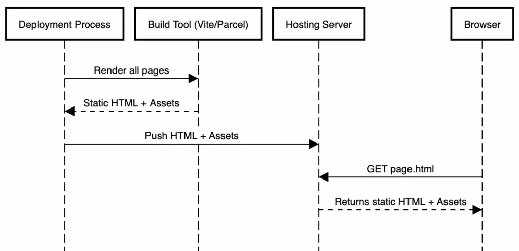 Ablauf: Build-Tool führt die Anwendung vorab aus → erzeugt statisches HTML + Assets → CDN liefert sofort.