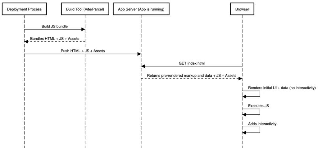 Bei jedem Request an den Server findet der Großteil der Datenverarbeitung und des Renderings auf dem Server statt. Das HTML wird dann an den Browser geschickt, während das JS-Bundle heruntergeladen wird, um Interaktivität hinzuzufügen (z. B. Events).